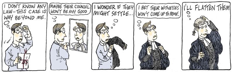 This cartoon is by Alex Williams who draws the Queen’s Counsel cartoons for The Times and in numerous books including Lawyers Uncovered. He also does the cartoons for BabyBarista and has had two more excellent books published recently: 101 Ways to Leave the Law and 101 Uses for a Useless Banker. He offers almost all of his cartoons for sale at £120 for originals and £40 for copies and they can be obtained from this email info@qccartoon.com.