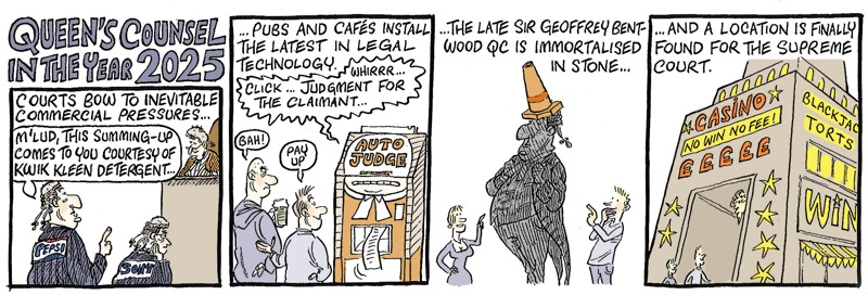 This cartoon is by Alex Williams who draws the Queen’s Counsel cartoons for The Times and in numerous books including Lawyers Uncovered. He also does the cartoons for BabyBarista and has had two more excellent books published recently: 101 Ways to Leave the Law and 101 Uses for a Useless Banker. He offers almost all of his cartoons for sale at £120 for originals and £40 for copies and they can be obtained from this email info@qccartoon.com.