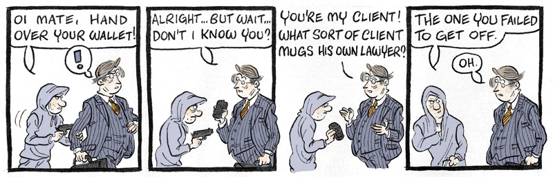This cartoon is by Alex Williams who draws the Queen’s Counsel cartoons for The Times and in numerous books including Lawyers Uncovered. He also does the cartoons for BabyBarista and has had two more excellent books published recently: 101 Ways to Leave the Law and 101 Uses for a Useless Banker. He offers almost all of his cartoons for sale at £120 for originals and £40 for copies and they can be obtained from this email info@qccartoon.com.
