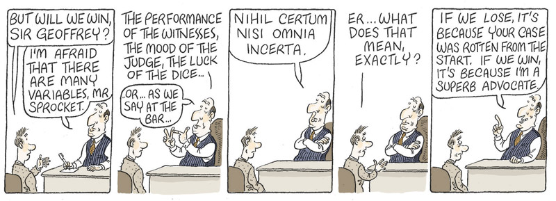 This cartoon is by Alex Williams who draws the Queen’s Counsel cartoons for The Times and in numerous books including Lawyers Uncovered. He also does the cartoons for BabyBarista and has had two more excellent books published recently: 101 Ways to Leave the Law and 101 Uses for a Useless Banker. He offers almost all of his cartoons for sale at £120 for originals and £40 for copies and they can be obtained from this email info@qccartoon.com.