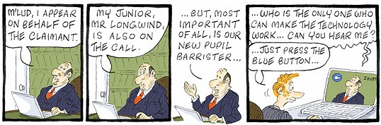 This cartoon is by Alex Williams who draws the Queen’s Counsel cartoons for The Times and in numerous books including The Queen’s Counsel Lawyer’s Omnibus. He offers almost all of his cartoons for sale at £120 for originals and £40 for copies and they can be obtained from this email info@qccartoon.com.